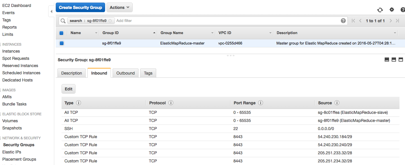 1) enable SSH access to our master node. This is done in the Security Groups pane of the EC2 services page.